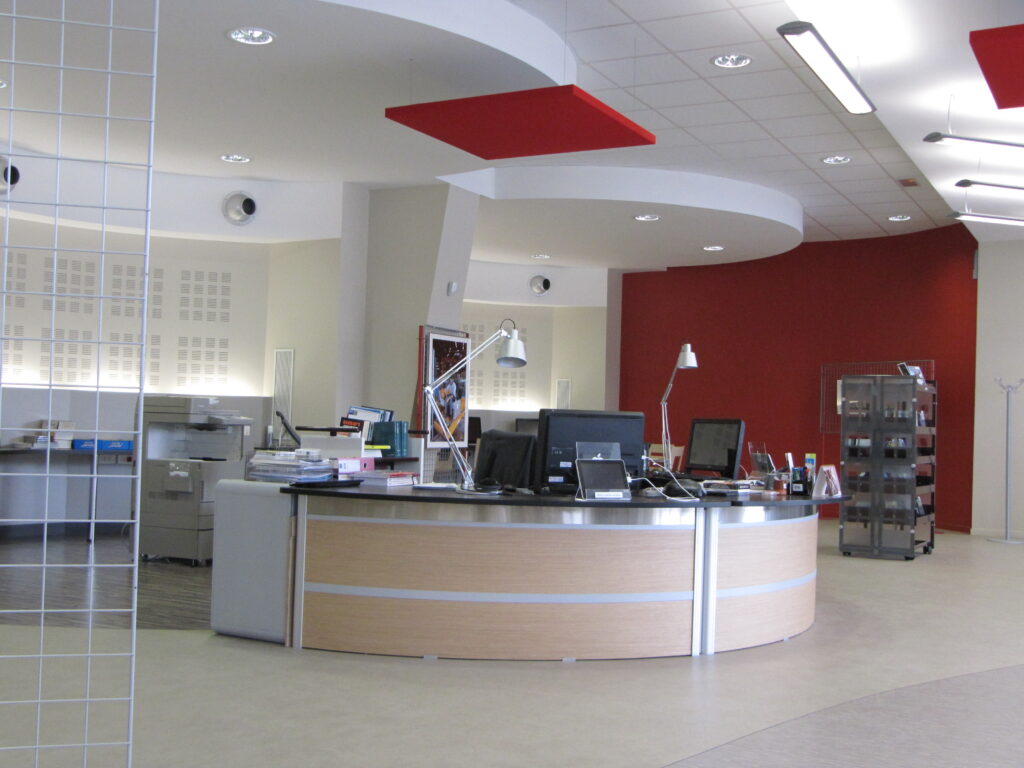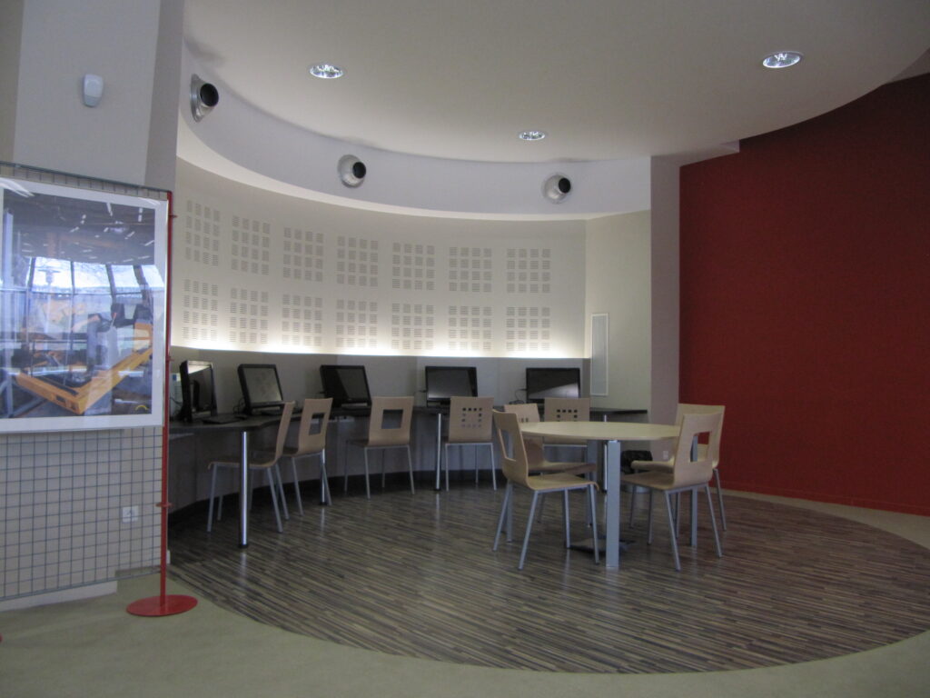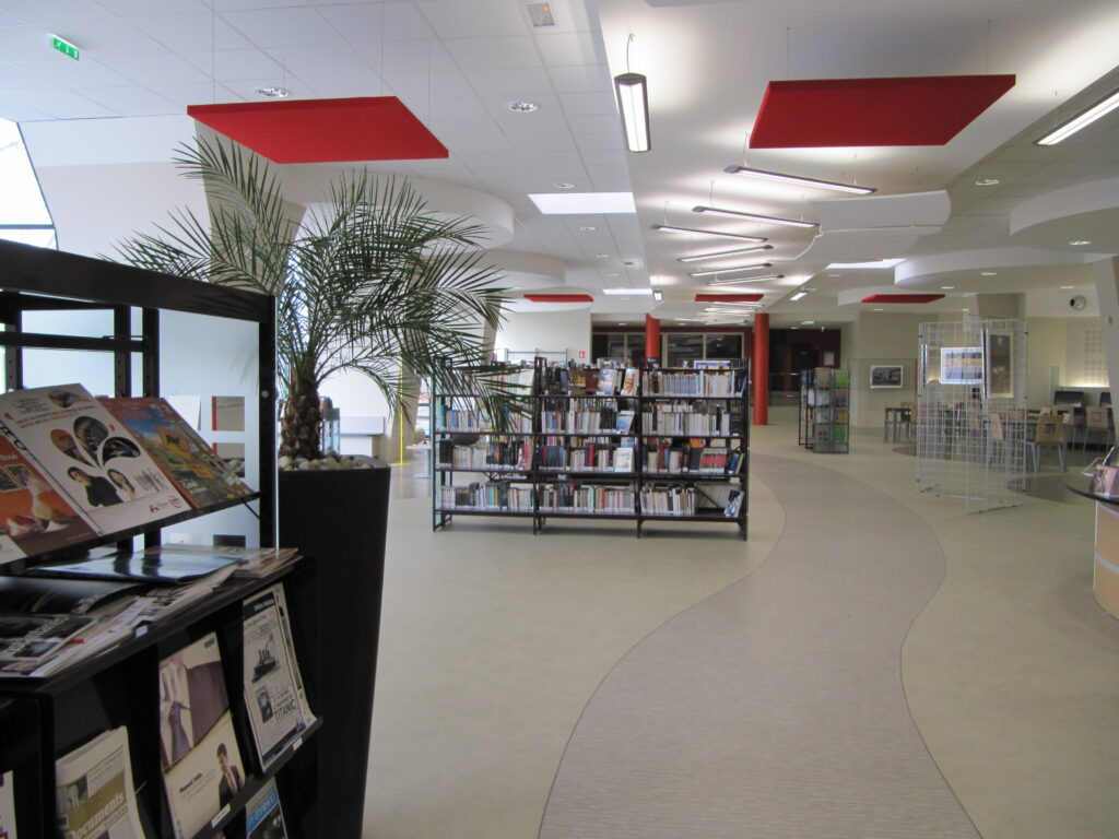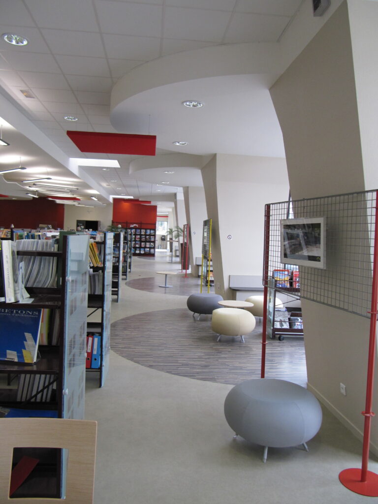 Médiathèque Mission : décoration sur le thème de l’eauChoix des couleurs et du mobilierCréation d’un chemin d’eau et de sièges en forme de galet